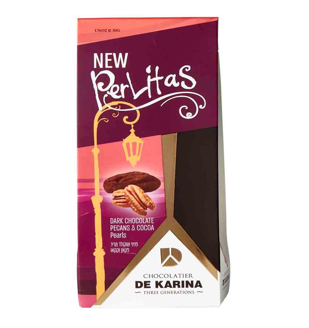 פניני שוקולד מריר במילוי אגוז פקאן ובמעטפת פתיתי קקאו דקיקים